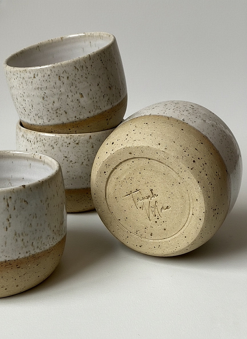 The Speckled Cup is made of good quality german beige speckled stoneware. Finished with a white glossy glaze.